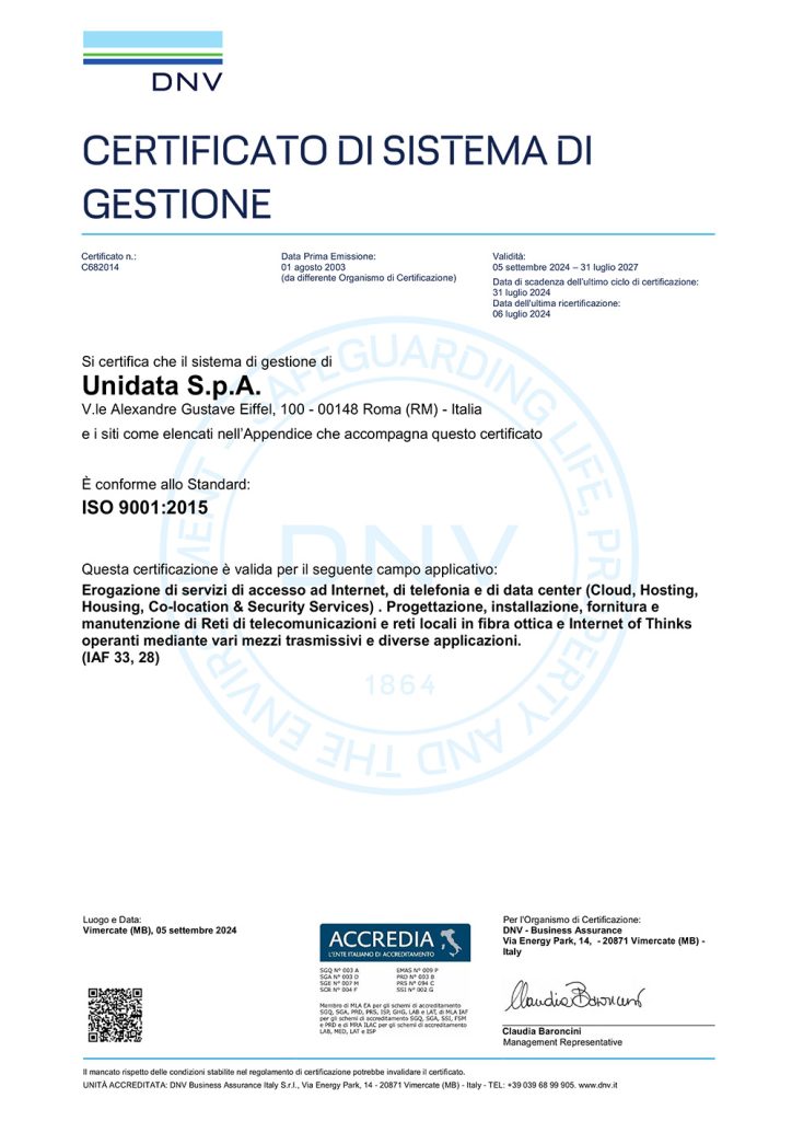 Sistema di Gestione della Qualità ai sensi della norma UNI EN ISO 9001:2015 per il seguente campo di applicazione: “Erogazione di servizi di accesso ad Internet, di telefonia e di data center (Cloud, Hosting, Housing, Co-location & Security Services). Progettazione, installazione, fornitura e manutenzione di Reti di telecomunicazioni e reti locali in fibra ottica e Internet of Things operanti mediante vari mezzi trasmissivi e diverse applicazioni” (settore IAF33 e IAF28)