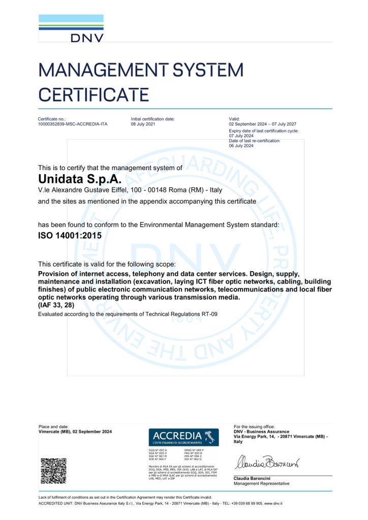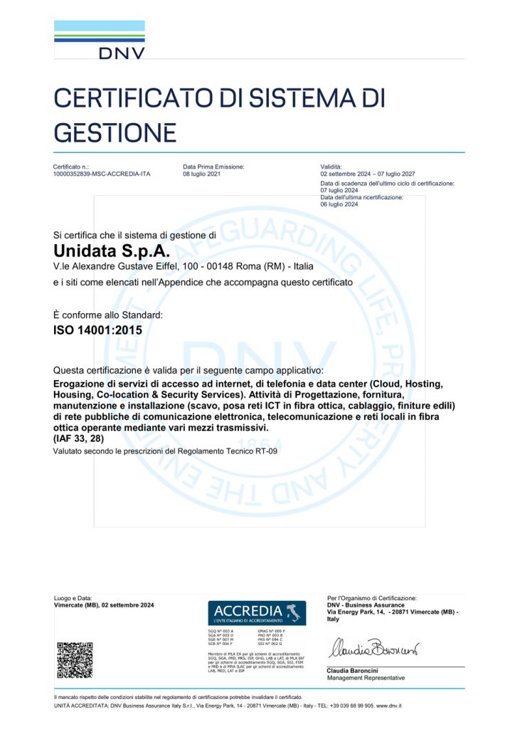 Sistema di Gestione Ambientale ai sensi della norma UNI EN ISO 14001:2015 per il seguente campo di applicazione: “Erogazione di servizi di accesso ad Internet, di telefonia e data center (Cloud, Hosting, Housing, Co-location & Security Services). Attività di Progettazione, fornitura, manutenzione e installazione (scavo, posa reti ICT in fibra ottica, cablaggio, finiture edili) di rete pubbliche di comunicazione elettronica, telecomunicazione e reti locali in fibra ottica operante mediante vari mezzi trasmissivi. (IAF 33, 28)” Valutato secondo le prescrizioni del Regolamento Tecnico RT-09