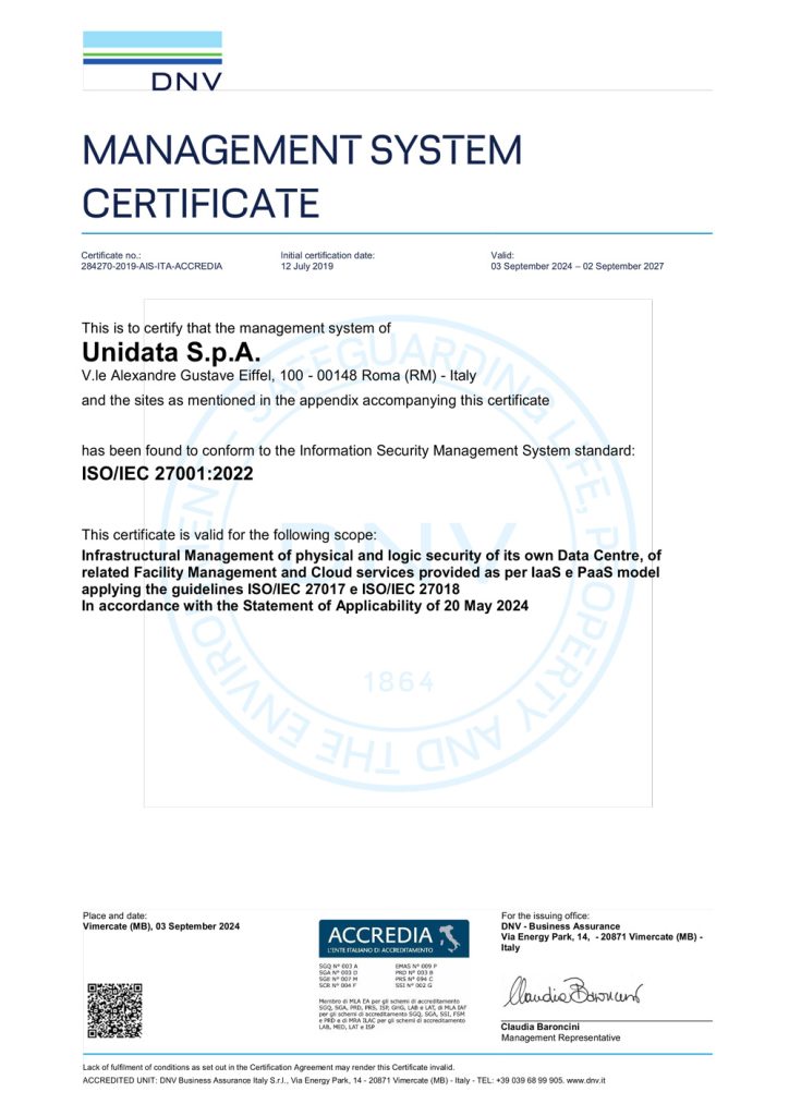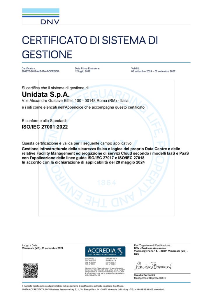 Sistema di Gestione della Sicurezza delle Informazioni ai sensi della norma ISO IEC 27001:2022 con l’applicazione delle linee guida ISO/IEC 27017 e ISO/IEC 27018 per il seguente campo di applicazione: “Gestione Infrastrutturale della sicurezza fisica e logica del proprio Data Centre e delle relative Facility Management ed erogazione di servizi Cloud secondo i modelli IaaS e PaaS con l’applicazione delle linee guida ISO/IEC 27017 e ISO/IEC 27018 In accordo con la dichiarazione di applicabilità del 20 Maggio 2024”