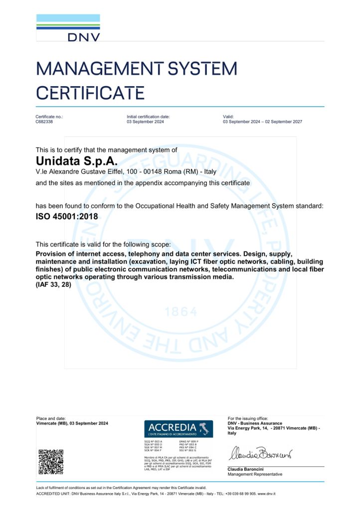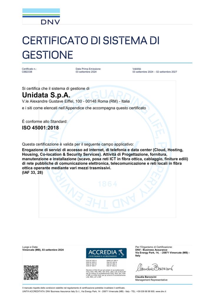 Sistema di Gestione per la salute e sicurezza sul lavoro ai sensi della norma UNI EN ISO 45001:2018 per il seguente campo di applicazione: “Erogazione di servizi di accesso ad Internet, di telefonia e data center (Cloud, Hosting, Housing, Co-location & Security Services). Attività di Progettazione, fornitura, manutenzione e installazione (scavo, posa reti ICT in fibra ottica, cablaggio, finiture edili) di rete pubbliche di comunicazione elettronica, telecomunicazione e reti locali in fibra ottica operante mediante vari mezzi trasmissivi”. (IAF 33, 28)